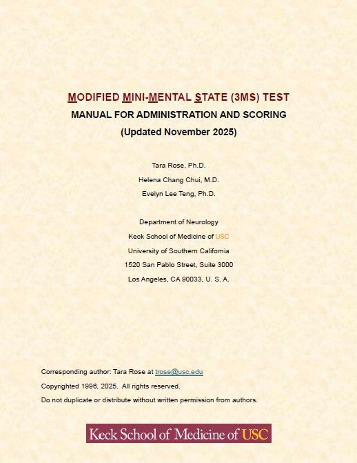 The M odified M ini M ental State - 3MS - Test was developed by Drs. Evelyn Teng, PhD and Helen Chang Chui, MD in 1987 at the University of Southern California. The cognitive screening and memory assessment measure expands upon the Mini-Mental State Examination (MMSE) by extending the scoring range from 0–30 to 0–100, using graded scoring and four additional items that reduce ceiling effects and broaden domain coverage.